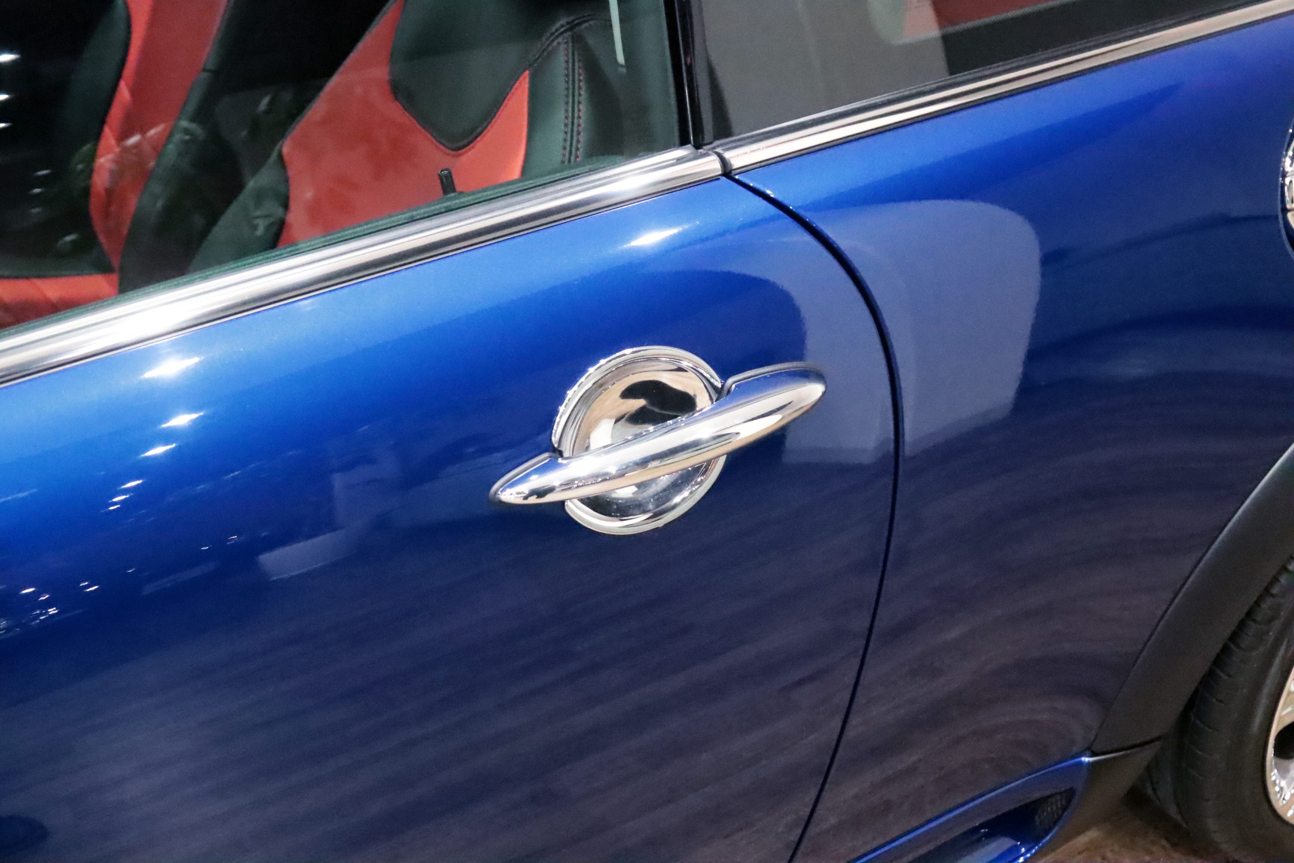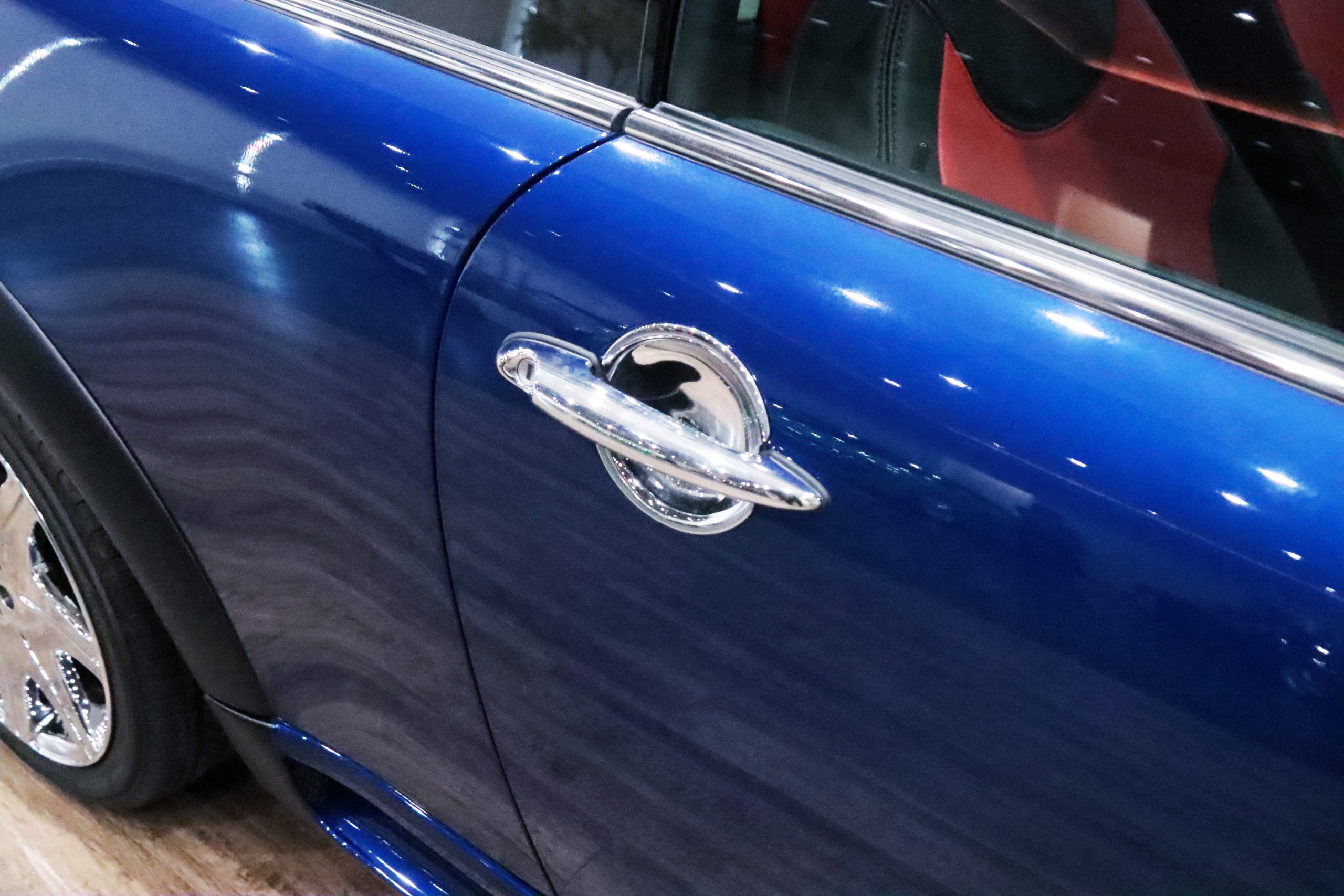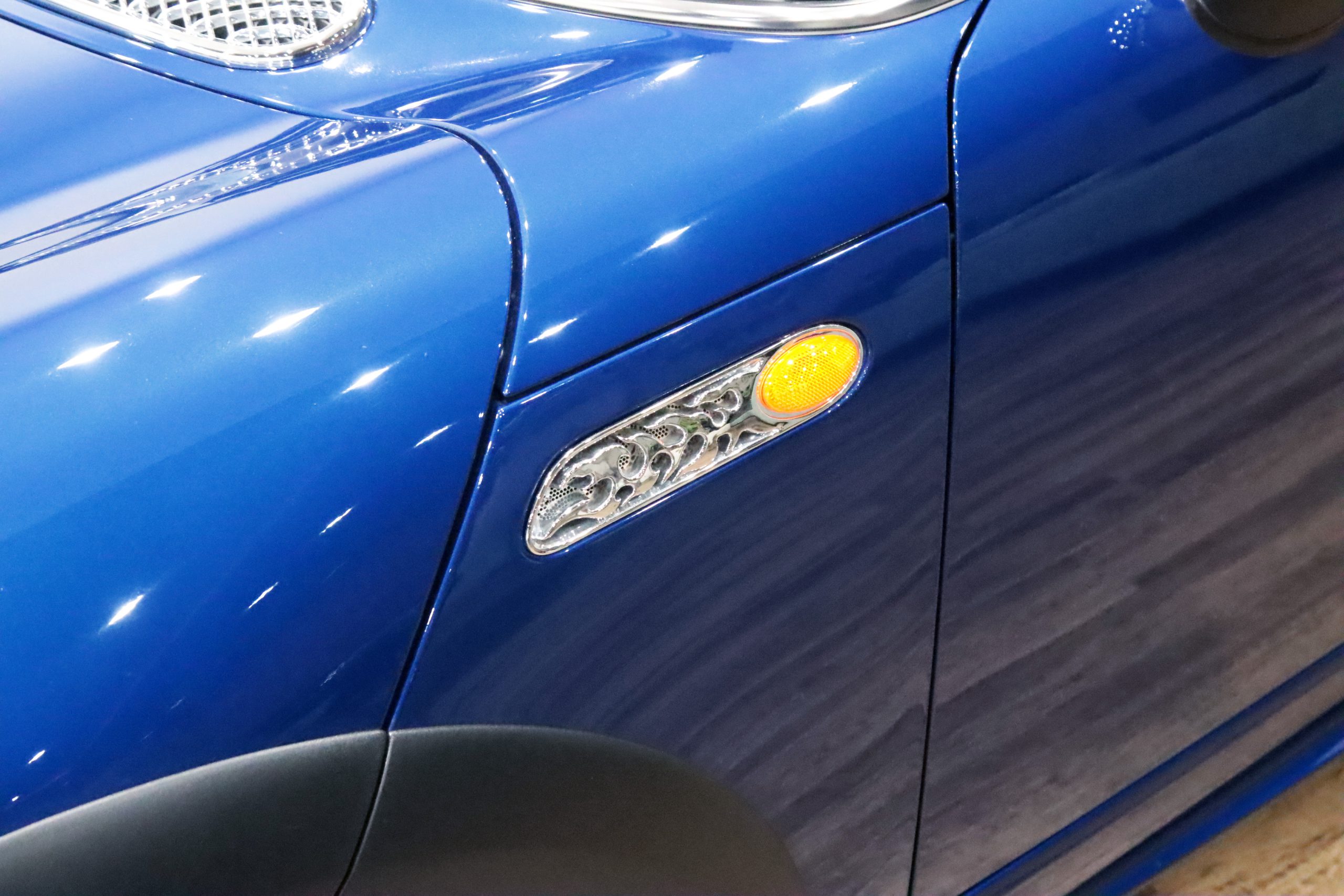 内外装共に驚くほど美しい状態で、インディブルーにクロームパーツやアルミ、赤/黒2トーンのDottyシートカバーが映えます!