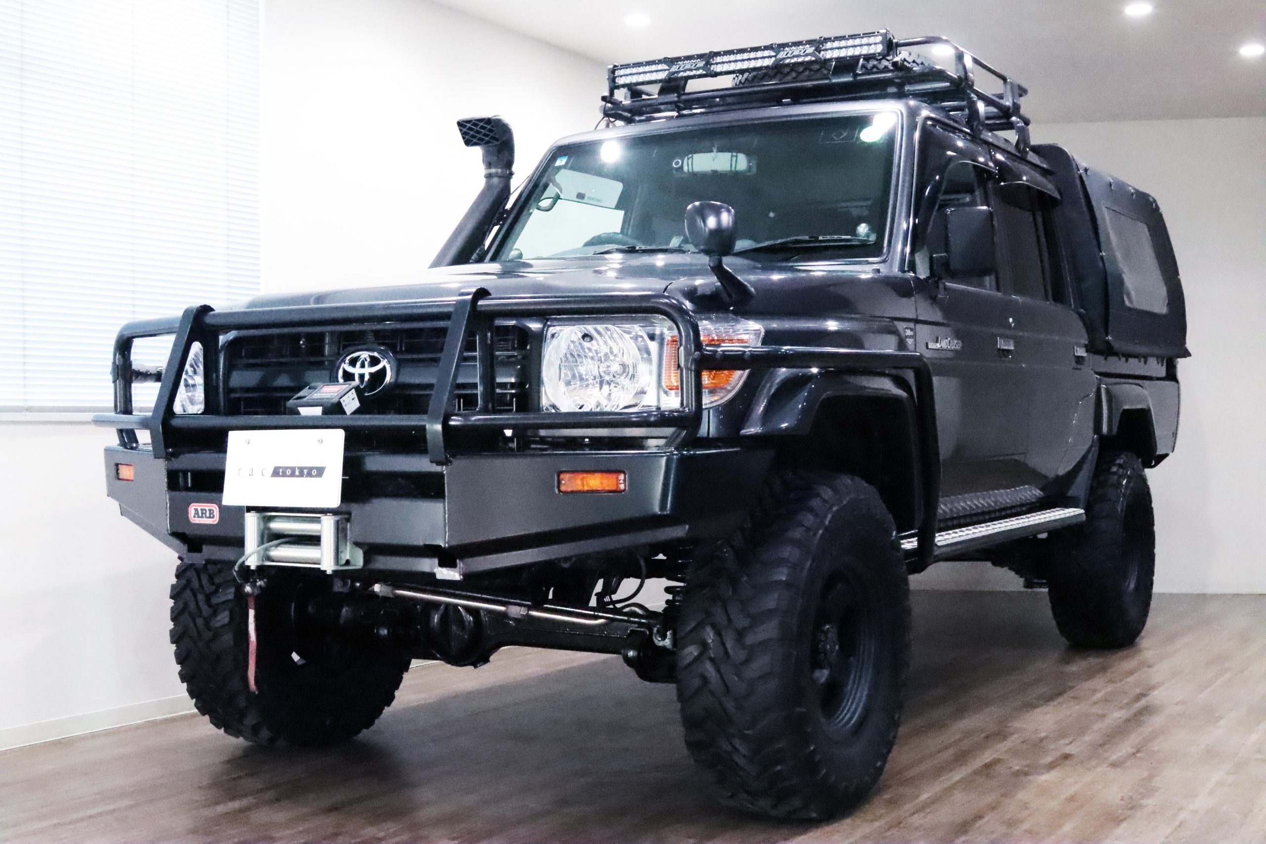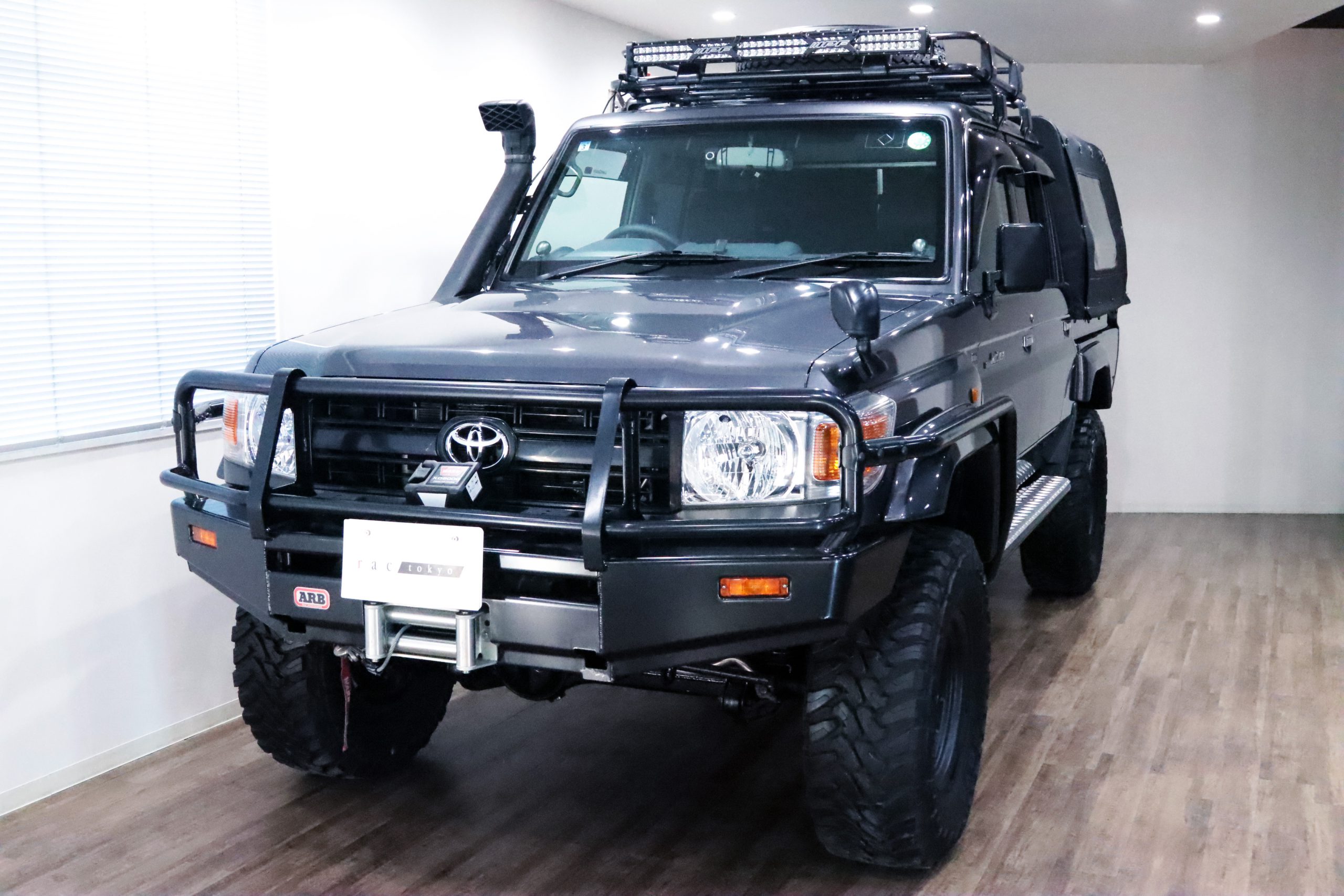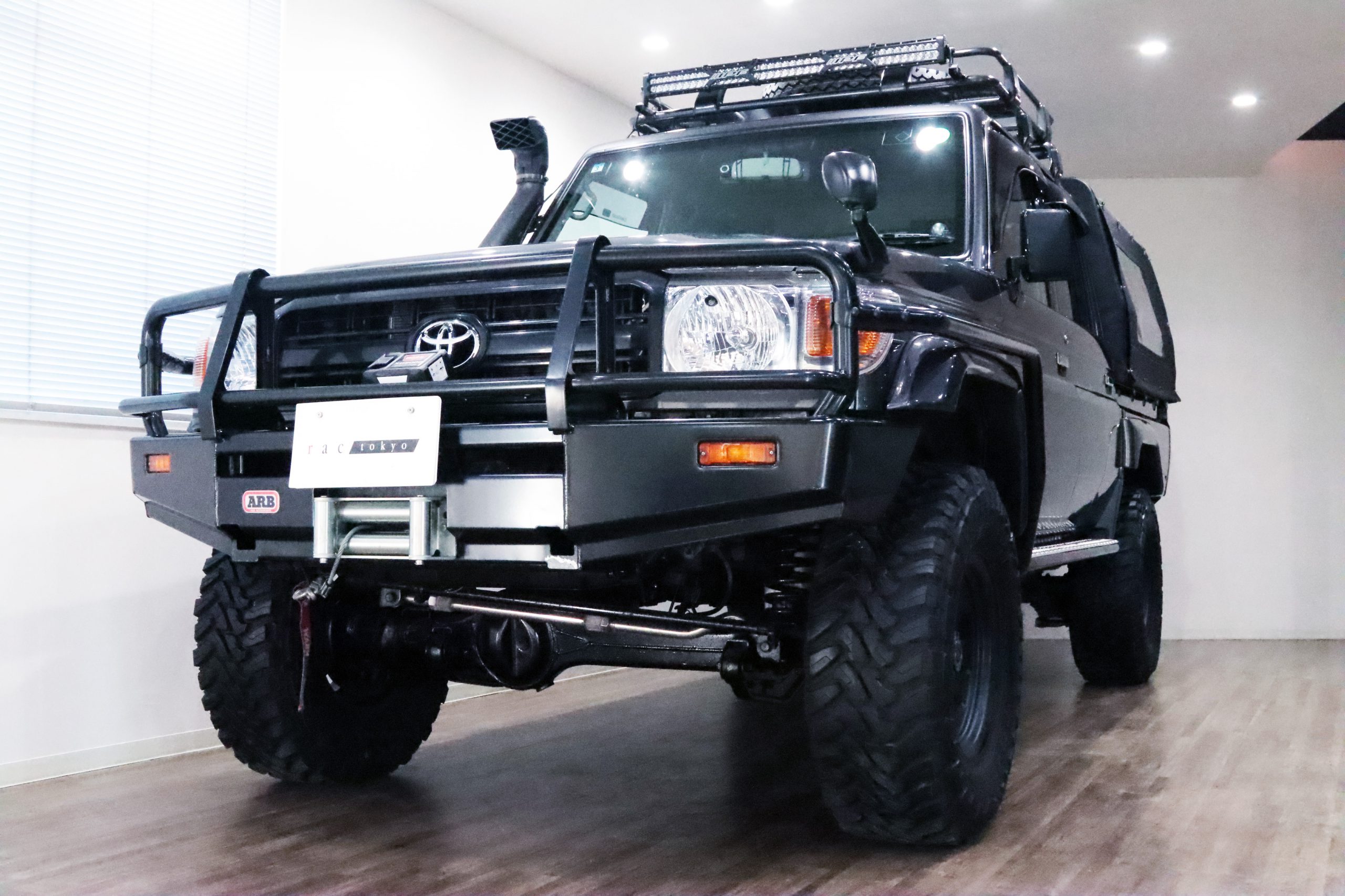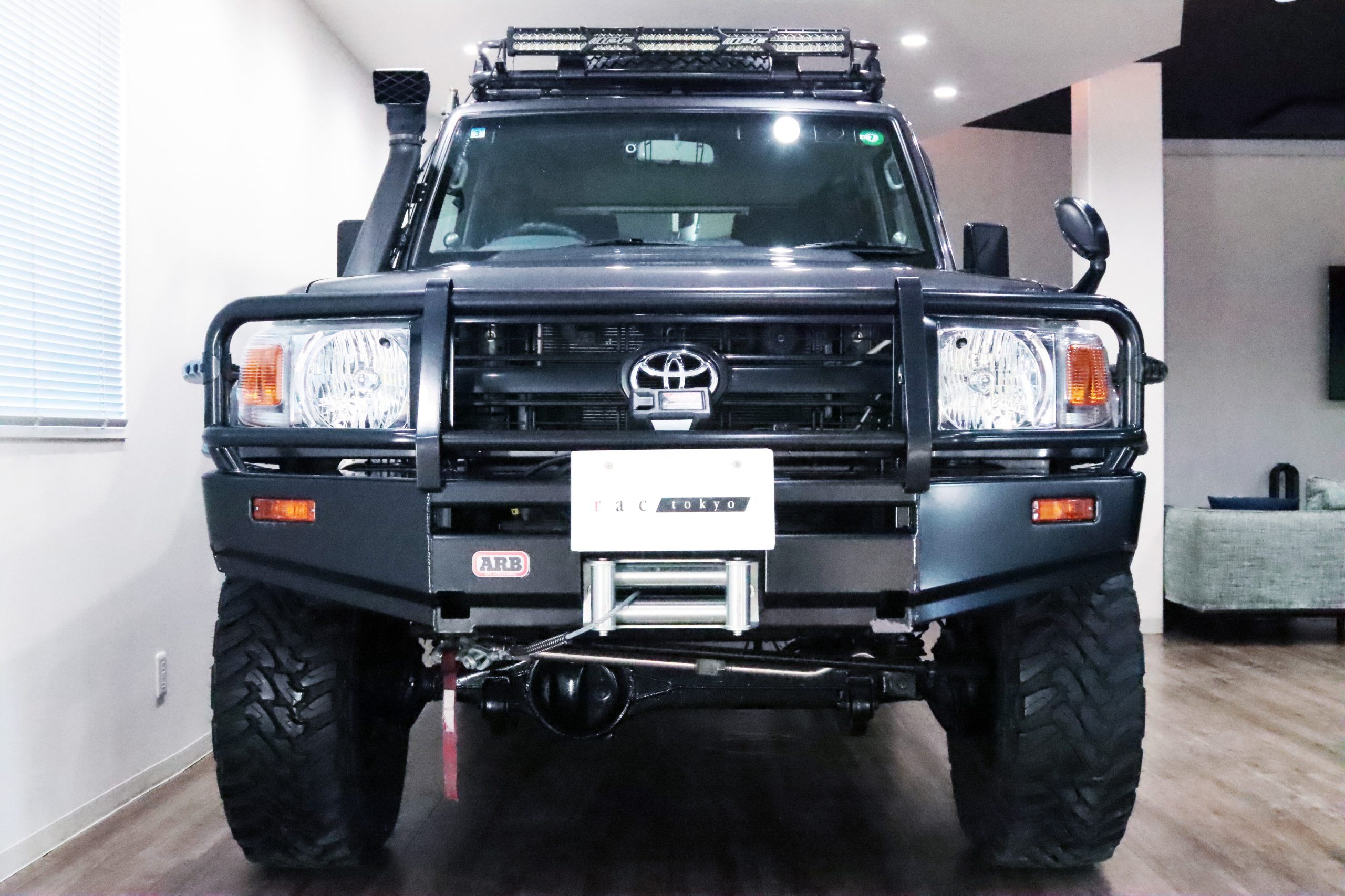 ARBコマーシャルバンパーからサイドレール、プロテクションサイドステップ、ルーフラック、サファリシュノーケル、WARNウィンチ等々、更にはインチアップしてキャンピング幌キットまで装着されていて、かなりのお金かけて仕上げてます!!